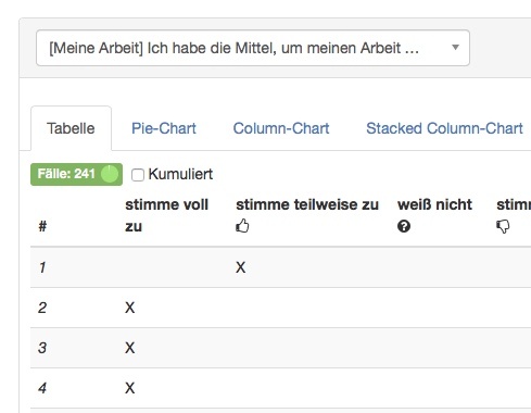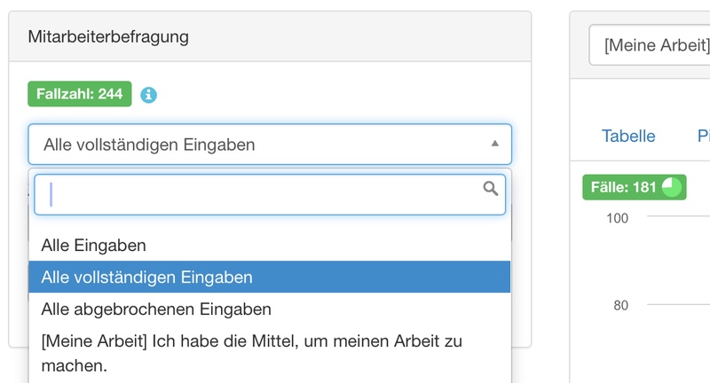 In der Filterauswahl des Auswertungsbereiches kann man nun die Befragten auf diejenigen einschränken, die die Umfrage vollständig beantwortet haben (und vice versa):