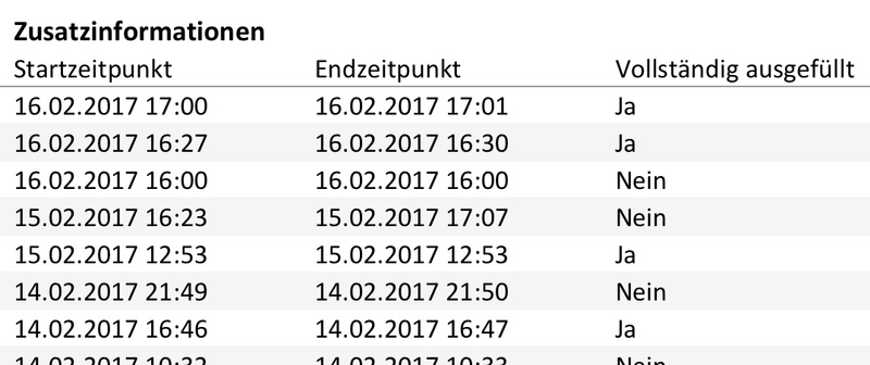 Dies betrifft auch die Ansicht in der Auswertung. Auch hier sind die neusten Einträge oben: